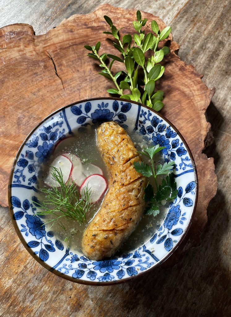Ziemniaki i selera ugotuj w lekko osolonej wodzie (ok. 1,5 L) z listkiem laurowym i zielem. Gdy warzywa się ugotują wyjmij je i ostudź. Wywaru po gotowaniu nie wylewaj.  Ziemniaki pognieć widelcem, selera posiekaj drobno, ugotowane buraki zetrzyj na drobnych oczkach, czosnek też. Całość dopraw i wymieszaj sprawnie ze skrobią ziemniaczaną.  Uformuj wałeczki w kształcie kiełbasek (jedna kiełbaska ok 100 g) i gotuj na małym ogniu w wywarze po gotowaniu ziemniaków, aż wypłyną a potem jeszcze 2 minuty.  Wyjmij z wywaru ostudź i posmaruj masłem klarowanym. Piecz 7 minut w 200 stopniach. Kiełbasek nie musisz podpiekać po ugotowaniu ale ten proces powoduje że mają przyjemną skórkę. Do wywaru warzywnego dodaj starty chrzan i sok z kapusty, dopraw. Na talerzu żurek udekoruj rzodkiewkąkoperkiem i natką.